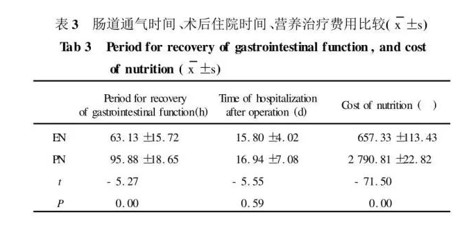 3.術(shù)后腸道通氣時(shí)間、術(shù)后住院時(shí)間及營(yíng)養(yǎng)治療費(fèi)用(表3)