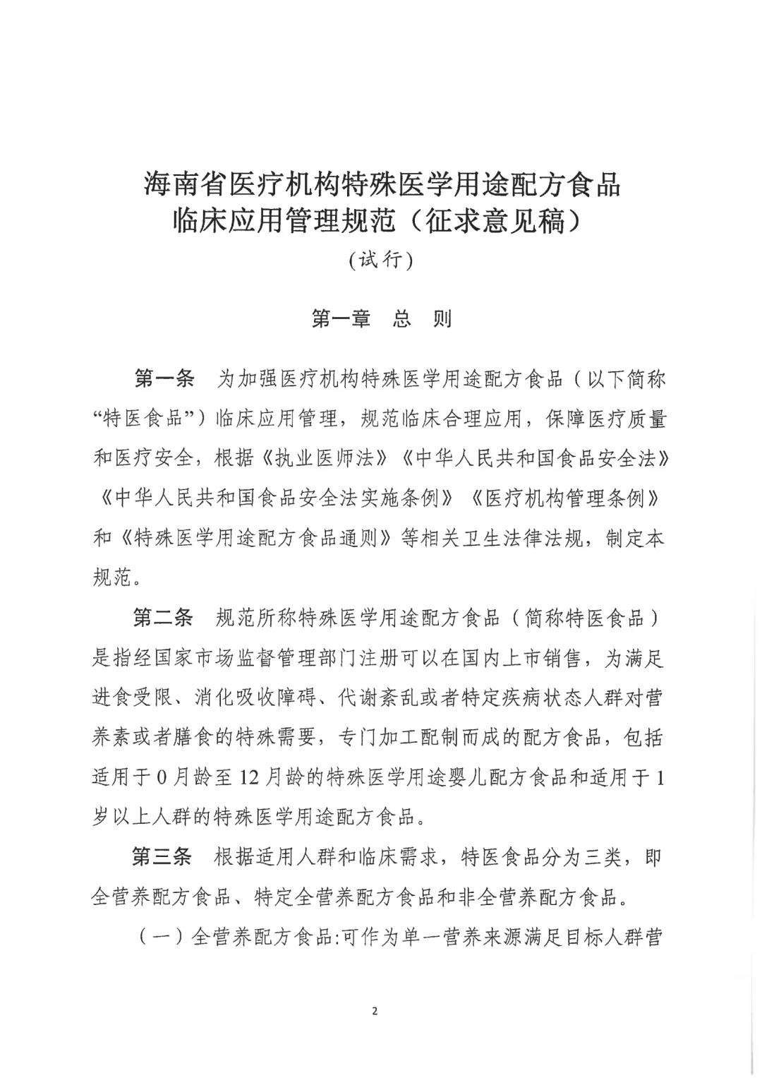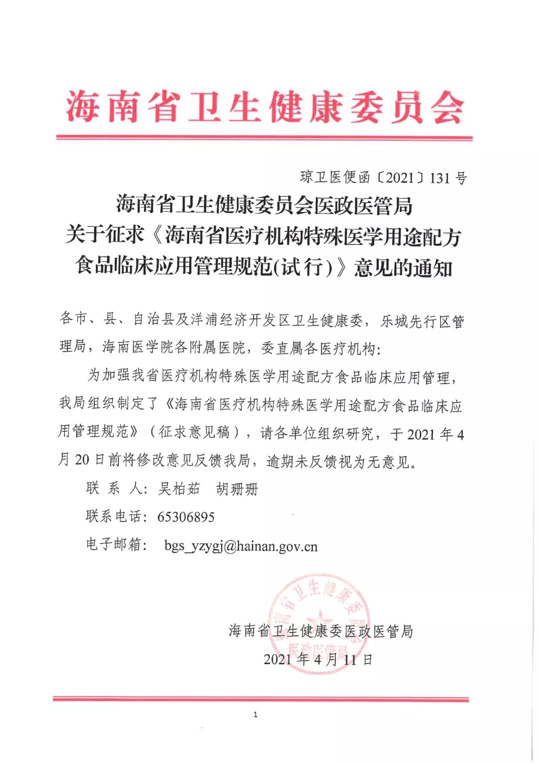 4月11日,海南省衛(wèi)生健康委員會(huì)印發(fā)關(guān)于征求《海南省醫(yī)療機(jī)構(gòu)特殊醫(yī)學(xué)用途配方食品臨床應(yīng)用管理規(guī)范(試行)》意見的通知,這是繼上海、湖北、山東、江蘇、黑龍江5省市之后,又一省級(jí)特醫(yī)食品應(yīng)用管理規(guī)范出臺(tái),本規(guī)范將進(jìn)一步助力健康產(chǎn)業(yè)發(fā)展,助推海南自由貿(mào)易港特醫(yī)體系建設(shè),積極推動(dòng)臨床營養(yǎng)科建設(shè)和特醫(yī)食品應(yīng)用于臨床治療,同時(shí)對(duì)其他各省制定相關(guān)管理規(guī)范具有參考意義。