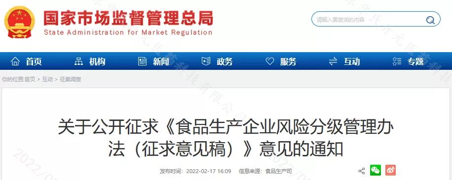 為推進食品生產企業(yè)食品安全風險分級與信用風險分類管理,優(yōu)化監(jiān)管資源配置,2022年2月17日,國家市場監(jiān)督管理總局發(fā)布了關于公開征求《食品生產企業(yè)風險分級管理辦法(征求意見稿)》意見的通知。