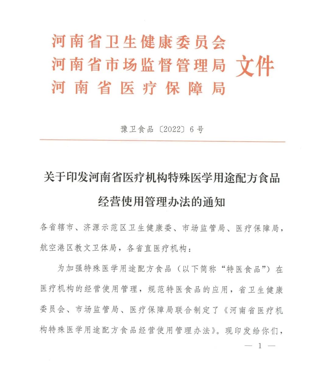 為加強(qiáng)特醫(yī)食品在醫(yī)療機(jī)構(gòu)的經(jīng)營(yíng)使用管理,2022年8月,河南省衛(wèi)健委、河南省市場(chǎng)監(jiān)管局、河南省醫(yī)保局聯(lián)合制定 《醫(yī)療機(jī)構(gòu)特殊醫(yī)學(xué)用途配方食品經(jīng)營(yíng)使用管理辦法》,要求河南省直醫(yī)療機(jī)構(gòu)遵照?qǐng)?zhí)行。辦法中要求: