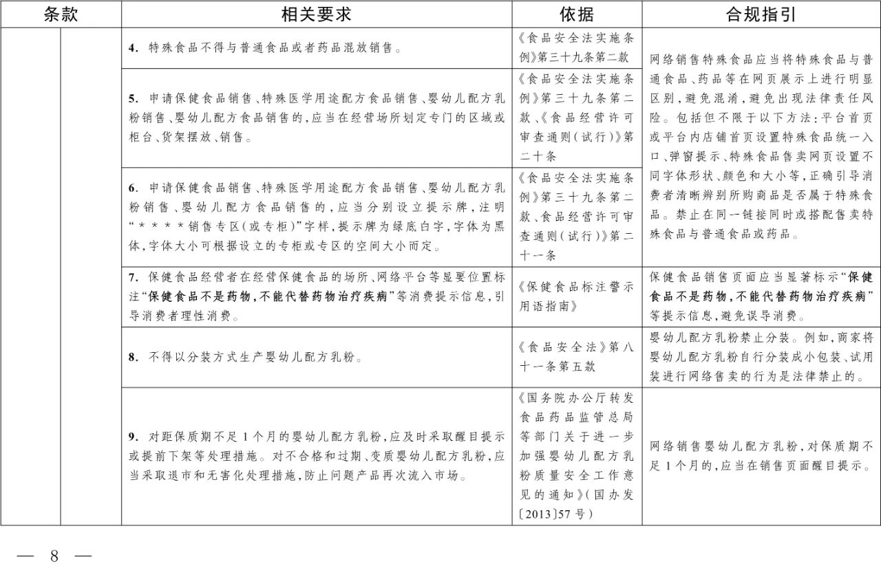 為規(guī)范網(wǎng)絡(luò)食品交易第三方平臺和入網(wǎng)食品經(jīng)營者銷售特殊食品行為,提高其合規(guī)意識,落實(shí)食品安全主體責(zé)任,保障網(wǎng)絡(luò)銷售特殊食品安全,根據(jù)《中華人民共和國食品安全法》及其實(shí)施條例、《電子商務(wù)法》、《網(wǎng)絡(luò)食品安全違法行為查處辦法》等法律法規(guī)和食品安全國家標(biāo)準(zhǔn)的規(guī)定,市場監(jiān)管總局組織制定了《網(wǎng)絡(luò)銷售特殊食品安全合規(guī)指南》,現(xiàn)印發(fā)給你們,請結(jié)合實(shí)際認(rèn)真貫徹落實(shí)。
