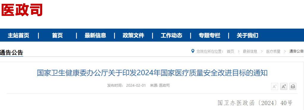 為進一步加強以目標為導向的醫(yī)療質量安全管理工作,我委組織制定了《2024年國家醫(yī)療質量安全改進目標》和各專業(yè)2024年質控工作改進目標,現(xiàn)印發(fā)給你們,請指導各級各專業(yè)質控組織、醫(yī)療機構、行業(yè)團體做好組織實施工作,優(yōu)化改進工作策略,創(chuàng)新工作機制和方式方法,深入推進目標管理,實現(xiàn)醫(yī)療質量安全持續(xù)改進。各地要進一步加強宣貫培訓,做好數(shù)據(jù)信息的收集、分析和反饋,不斷提升醫(yī)療質量安全管理水平。