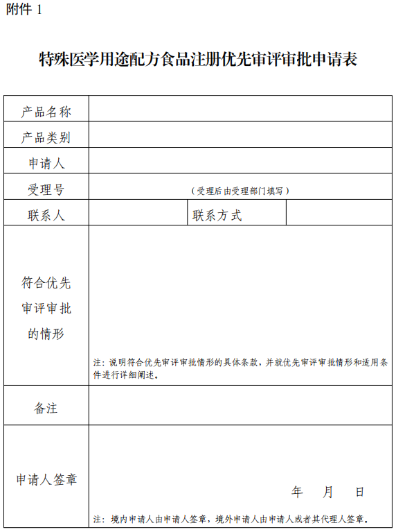 (一)申請注冊 申請人應當在提交特殊醫(yī)學用途配方食品注冊申請的同時,提 交《特殊醫(yī)學用途配方食品注冊優(yōu)先審評審批申請表》(附件 1), 并掃描電子版上傳至特殊醫(yī)學用途配方食品注冊申請系統(tǒng)。