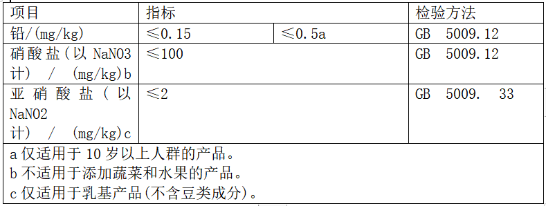特殊醫(yī)學(xué)用途配方食品的污染物指標(biāo)主要監(jiān)測鉛、硝酸鹽(NO5)和亞硝酸鹽(NO2)三項(xiàng),污染物限量見表2(制表:馬超)。