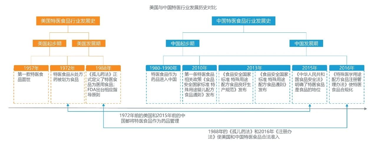 在美國(guó),特醫(yī)食品行業(yè)的政策是一個(gè)由緊到松的發(fā)展過(guò)程。1972年之前,特醫(yī)食品以處方藥的形式進(jìn)行管理。1972年,特醫(yī)食品從處方藥被歸為食品,監(jiān)管逐漸放寬。