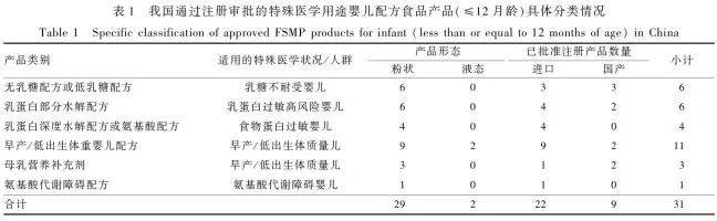 表1 我國(guó)通過(guò)注冊(cè)審批的特殊醫(yī)學(xué)用途嬰兒配方食品產(chǎn)品(≤12月齡)具體分類(lèi)情況Table 1 Specific classification of approved FSMP products for infant (less than or equal to 12 months of age) in China