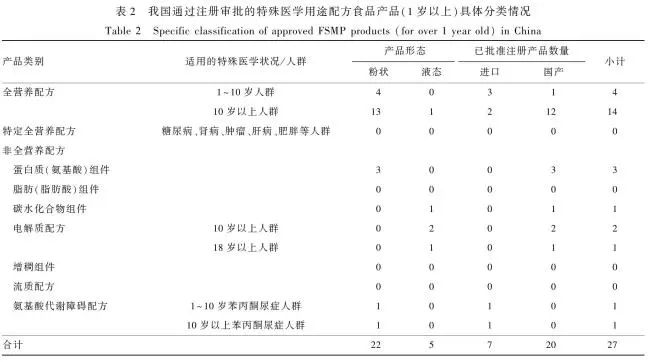 表2 我國(guó)通過(guò)注冊(cè)審批的特殊醫(yī)學(xué)用途配方食品產(chǎn)品(1歲以上)具體分類(lèi)情況Table 2 Specific classification of approved FSMP products (for over 1 year old) in China