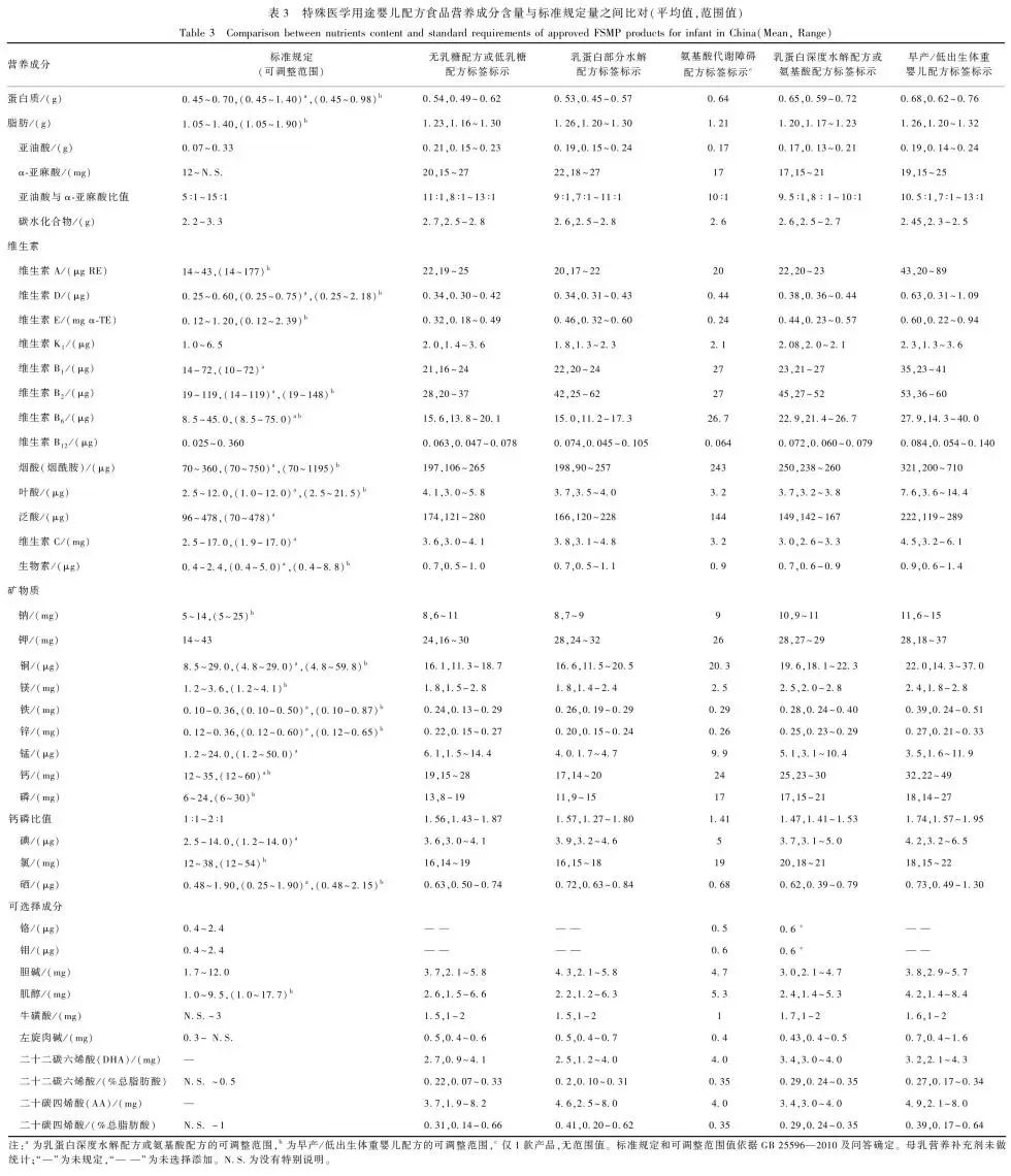 表3 特殊醫(yī)學(xué)用途嬰兒配方食品營(yíng)養(yǎng)成分含量與標(biāo)準(zhǔn)規(guī)定量之間比對(duì)(平均值,范圍值)Table 3 Comparison between nutrients content and standard requirements of approved FSMP products for infant in China (Mean, Range)