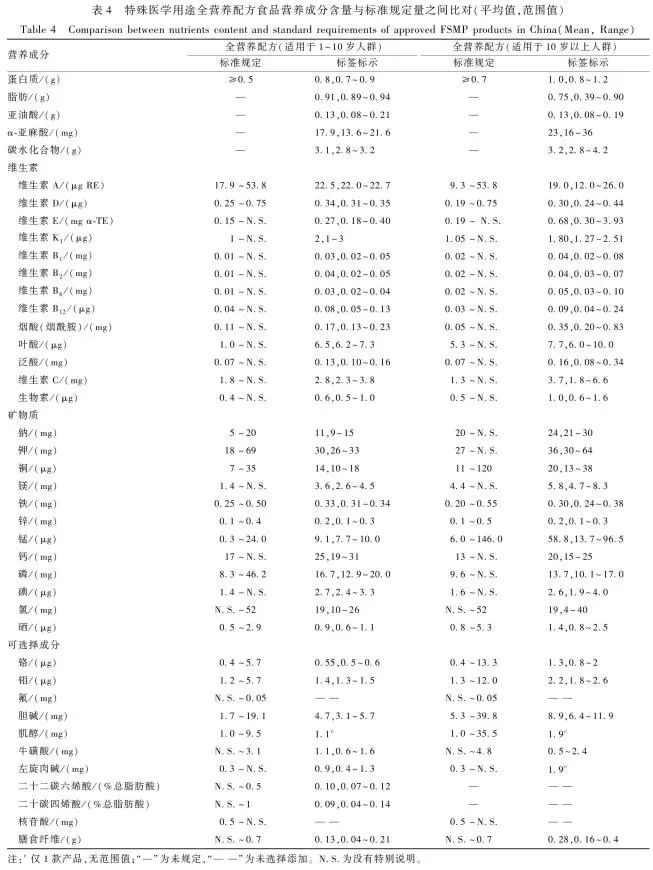 表4 特殊醫(yī)學(xué)用途全營(yíng)養(yǎng)配方食品營(yíng)養(yǎng)成分含量與標(biāo)準(zhǔn)規(guī)定量之間比對(duì)(平均值,范圍值)Table 4 Comparison between nutrients content and standard requirements of approved FSMP products in China (Mean, Range)