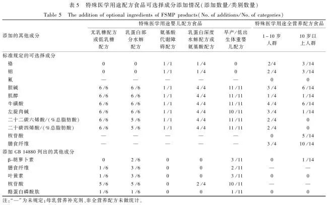 表5 特殊醫(yī)學(xué)用途配方食品可選擇成分添加情況(添加數(shù)量/類(lèi)別數(shù)量)Table 5 The addition of optional ingredients of FSMP products (No.of additions/No.of categories)