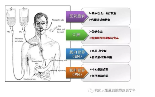 根據(jù)營(yíng)養(yǎng)供給方式分為經(jīng)胃腸道提供應(yīng)用的“腸內(nèi)營(yíng)養(yǎng)支持(enteral nutrition,EN) ”和經(jīng)靜脈途徑提供應(yīng)但不能經(jīng)口正常攝食的用的“腸外應(yīng)用支持 (parental nutrition,PN)”。只要目腸道功能存在或部分存在,重癥患者,應(yīng)優(yōu)先、盡早考慮給予腸內(nèi)營(yíng)養(yǎng),只有腸內(nèi)營(yíng)養(yǎng)不可實(shí)施時(shí)才考慮腸外營(yíng)養(yǎng)。