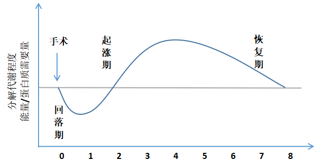 手術(shù)可導(dǎo)致機(jī)體發(fā)生一系列相應(yīng)的創(chuàng)傷和應(yīng)激,機(jī)體會(huì)隨之產(chǎn)生一系列代謝改變,經(jīng)歷回落期、起漲期、恢復(fù)期3個(gè)動(dòng)態(tài)時(shí)期,詳見(jiàn)圖1。
