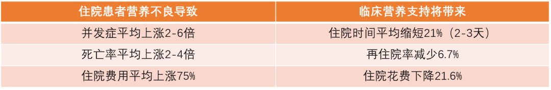 營(yíng)養(yǎng)不良導(dǎo)致對(duì)醫(yī)療資源和經(jīng)濟(jì)開支的需求增加[3]。根據(jù)研究數(shù)據(jù)顯示:有營(yíng)養(yǎng)診斷的患者并發(fā)癥發(fā)生率是普通患者的2-6倍,死亡率平均上漲2-4倍,住院費(fèi)用平均增加75%[4]。而營(yíng)養(yǎng)干預(yù)作為一種經(jīng)濟(jì)、有效的治療手段,可以平均縮短患者住院時(shí)間2-3天,減少再住院率6.7%,降低住院花費(fèi)21.6%[5]。