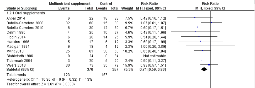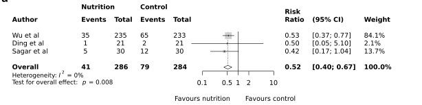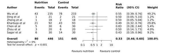 一項meta分析納入7項研究,共891例胃腸腫瘤手術(shù)患者,其中446例為ONS組(含有宏量營養(yǎng)素及含或不含微量營養(yǎng)素),445例為對照組(接受常規(guī)護(hù)理),旨在評估術(shù)前ONS對低收入國家胃腸癌手術(shù)患者的影響10。結(jié)果顯示,術(shù)前ONS降低了術(shù)后全因手術(shù)并發(fā)癥(RR= 0.53, 95% CI 0.46-0.60, P < 0.001, I2 = 0%,n = 891)、感染(RR=0.52,0.40 - 0.67,P = 0.008, I2 = 0%,n = 570)。表明,術(shù)前使用ONS可有效降低胃腸手術(shù)患者手術(shù)相關(guān)并發(fā)癥風(fēng)險。