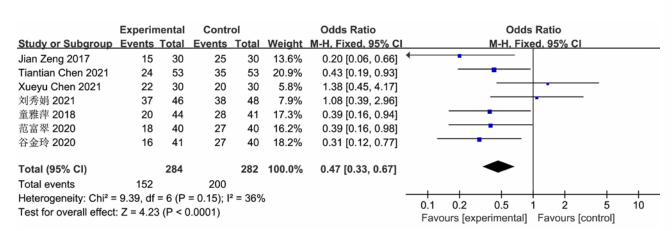 圖4 試驗組與對照組營養(yǎng)不良發(fā)生率比較的森林圖