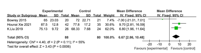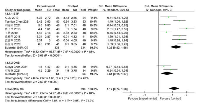 一項meta分析納入納入14篇文獻(xiàn),包括1040例食管癌根治術(shù)患者,試驗組患者接受HEN支持[腸內(nèi)管飼(ETF)和ONS均可],對照組僅接受常規(guī)口服飲食,旨在評價HEN對食管癌根治術(shù)患者的有效性和安全性12。meta分析結(jié)果顯示,試驗組營養(yǎng)不良發(fā)生率低于對照組(OR=0.47,95%CI=0.33-0.67,P<0.0001),試驗組軀體功能評分高于對照組(MD=6.67,95%CI=2.86-10.48,P=0.0006)在ETF亞組和ONS亞組分析中,試驗組血清白蛋白(ALB)增長值均高于對照組(SMD=1.25,95%CI=0.82-1.68,P<0.00001;SMD=0.61,95%CI =0.26-0.97,P<0.00001)。表明,ONS干預(yù)可顯著改善食管癌手術(shù)患者營養(yǎng)狀況,降低營養(yǎng)不良風(fēng)險,改善患者軀體功能。