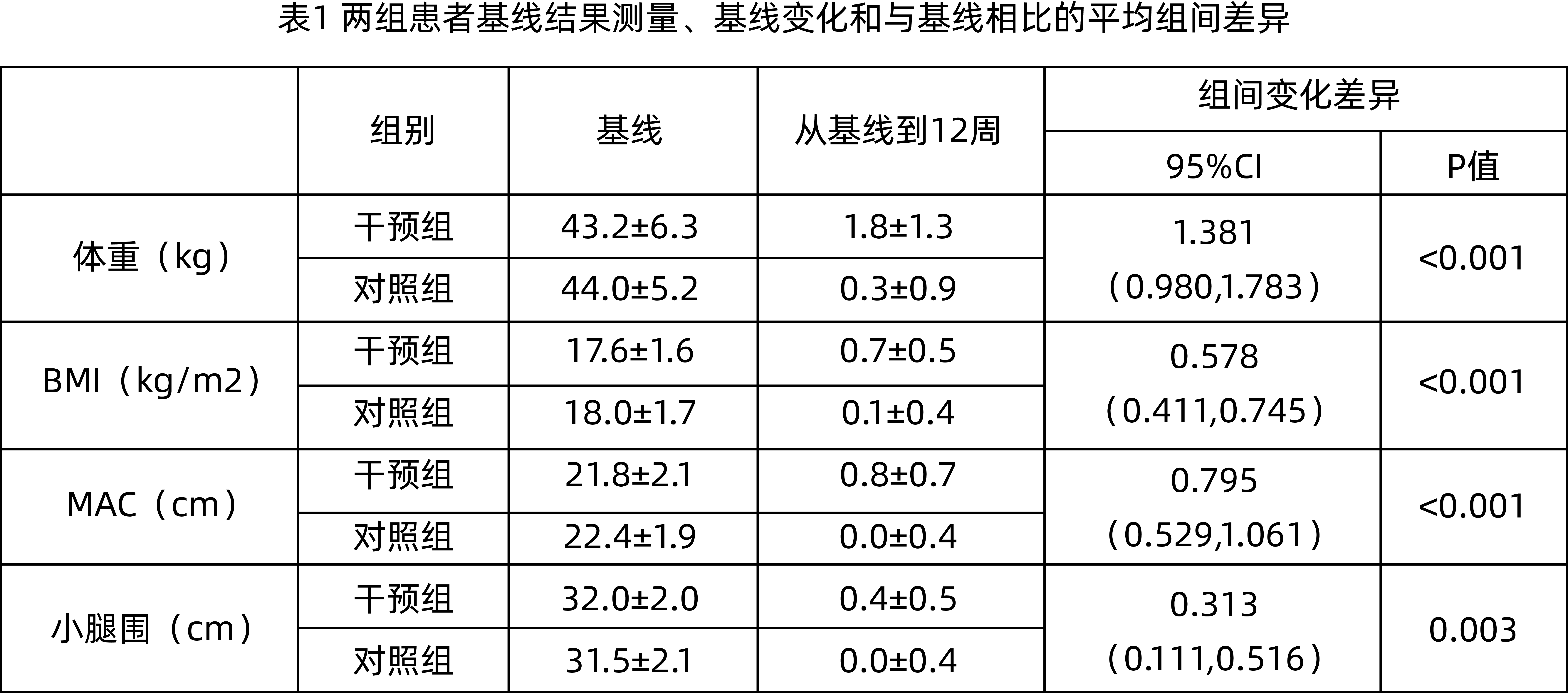 研究結(jié)果顯示,干預(yù)組平均體重、身體質(zhì)量指數(shù)(BMI)、中臂圍(MAC)、小腿圍從基線到12周的平均增加量均顯著高于對照組(表1)。