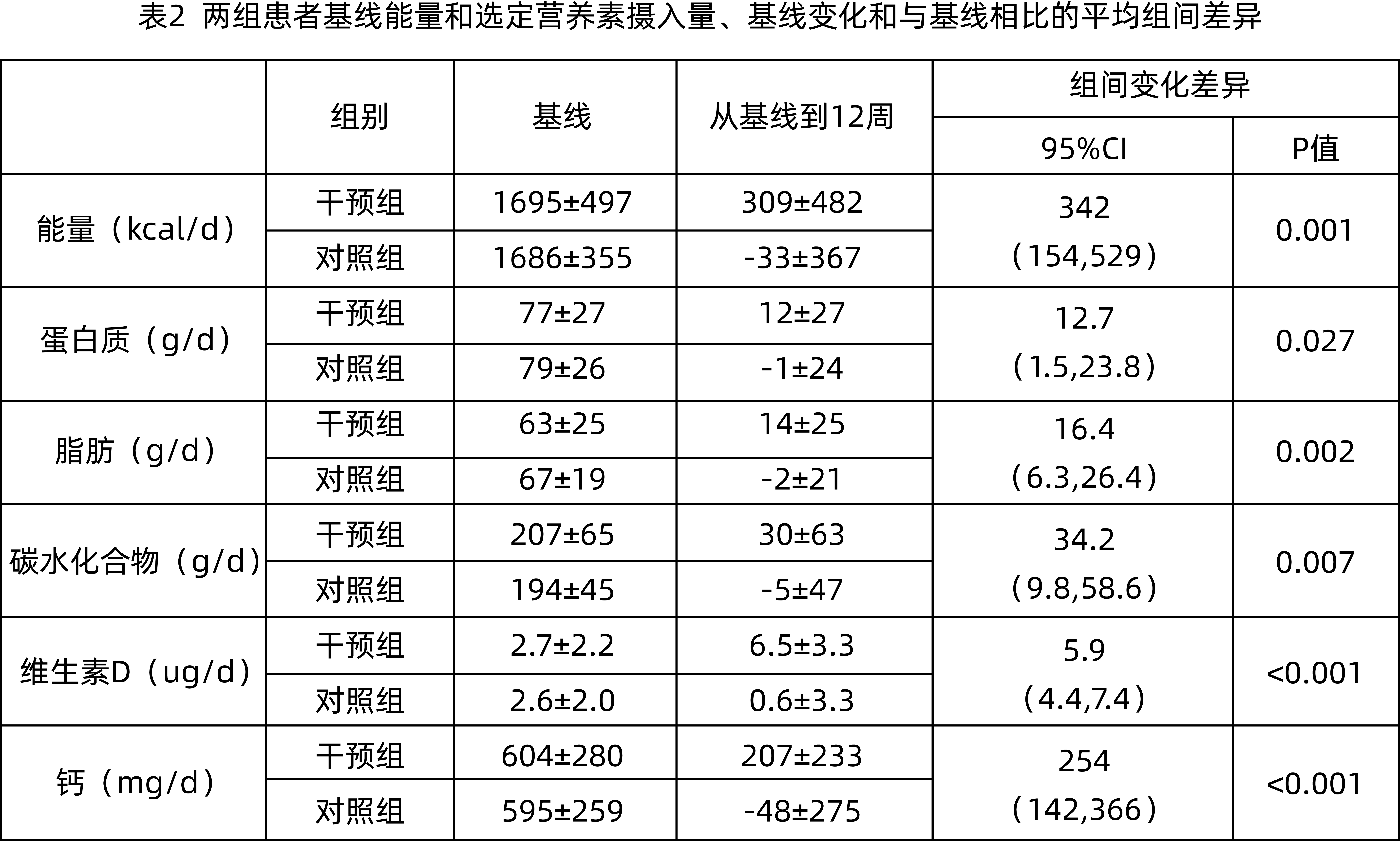 12周后,結(jié)果顯示,干預(yù)組能量、脂肪、碳水化合物、蛋白質(zhì)、維生素D和鈣攝入量的平均增幅也顯著高于對照組(表2)。